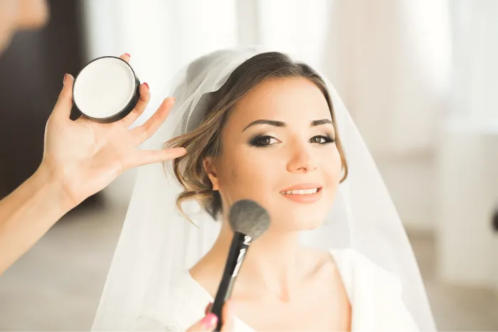 Création de maquillage sophistiqué pour mariée en accord avec la robe et la décoration du lieu.