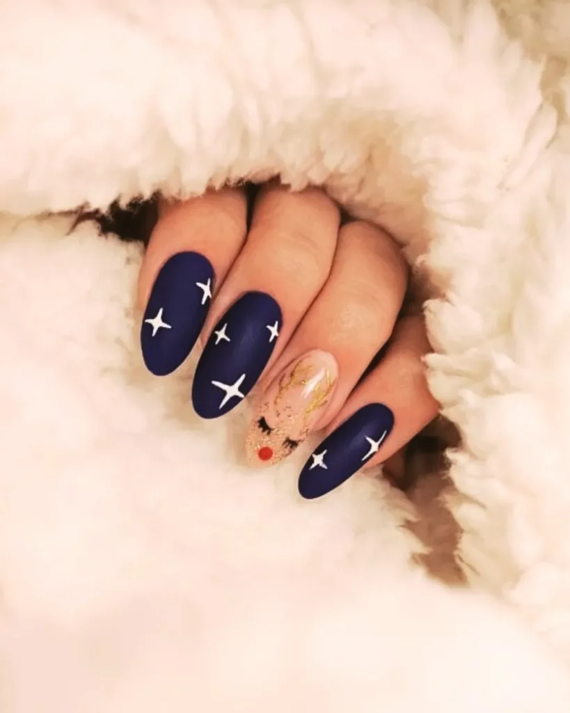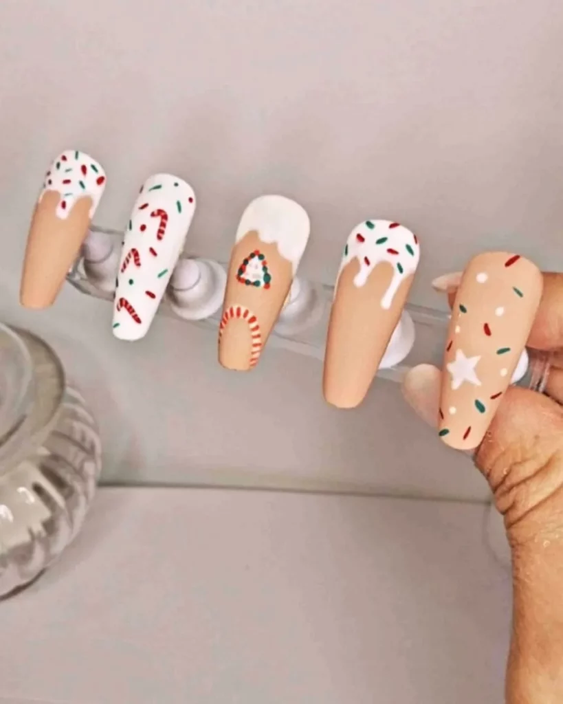 Le nail art est la technique parfaite pour apporter de la magie au bout de vos doigts pendant les fêtes ✨. Choisissez un thème de Noël qui vous inspire : flocons de neige, bonhommes de pain d’épice, rennes ou encore guirlandes colorées. À l’aide d’un pinceau fin, faites de beaux dessins détaillés qui rappellent l’esprit de Noël. Optez pour une illustration complète sur chacun de vos doigts ou sélectionnez-en un ou deux pour quelque chose de plus discret. Avec cette méthode, vous personnalisez votre manucure selon vos envies et affichez des ongles uniques qui attirent tous les regards.